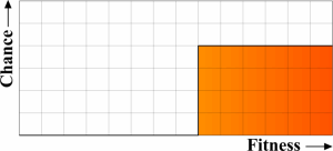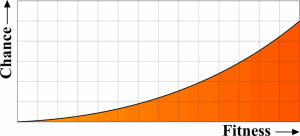 Another common pattern in nature is Biased Selection, where the chance of mating increases as the fitness increases. This is something we typically see with species that form stable couples. Everyone is basically capable of finding a mate, but the really attractive individuals manage to get a lot of hanky-panky on the side, thus increasing their chances of becomes genetic founders for future generations. Biased Selection can be amplified by using power functions, which have the effect of flattening or exaggerating the curve.