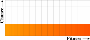 No matter where you find yourself on this fitness graph, your chances of ending up in a mating couple are constant. You might think that this is a particularly pointless selection strategy as it does nothing to further the evolution of the gene-pool. But it is not without precedent in nature. Take for example wind-pollination or coral spawning. If you’re a sexually functioning member of such a species, you get to play ball come mating season. Another example would be females in a walrus colony. Every female in a colony gets to breed with the dominant male, no matter how fit or unfit she is. Isotropic Selection is certainly not without function either. For one, it dampens the speed with which a population runs uphill. It therefore acts as a safe-guard against a premature colonization of a local -and possibly inferior- optimum.