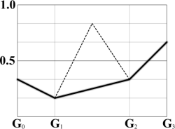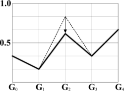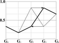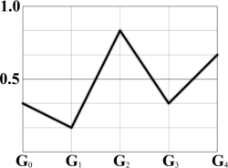 Here for example we have a genome consisting of 5 genes. This genome is thus a point in the 5-dimensional space that delineates this particular species. When G0 is drawn at ⅓, it means that the value is one-third between the minimum and maximum allowed limits. The benefit of this graph is that it becomes quite easy to spot sub-species in a population, as well as lone individuals. When we apply mutations to a genome, we should see a change in the graph, as every unique genome has a unique graph.