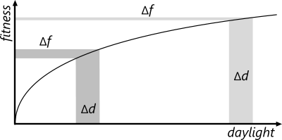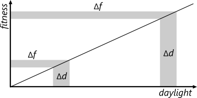 Where Δd denotes a change in daylight and Δf the corresponding change in fitness. No matter where you are, a specific loss in daylight results in a specific loss of fitness. What we want is something that looks like this: