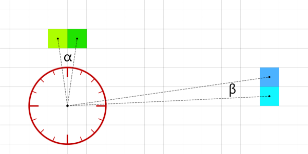 The angle α is larger than β because the green pixels are closer to the dial than the blue pixels. So as users we can adjust how much effect a radial mouse displacement has simply by moving the cursor towards or away from the dial. Although one could implement a similar effect in linear sliders (the further away the mouse from the slider, the less the effect of a mouse translation), it would not be anywhere near as intuitive and controllable as the native behaviour of the dial.