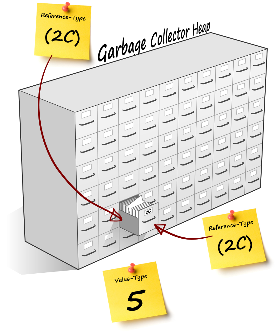 A good analogy may be to imagine variables as pieces of paper with information written on them. You can always copy the contents of one piece of paper onto another, and you’d end up with two disjoint instances of the same data. Changing one will not affect the other. Value-Types are simply pieces of paper with something written on it, Reference types are pieces of paper with a code written on them. This code tells you in what drawer of the Garbage Collector cabinet to find your data: