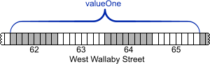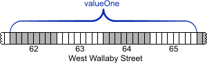 As far as programmatic logic is concerned, this is very simple indeed. All we do is define an integer and give it a value 5. Then define another integer, assign it whatever value the first integer happens to have and then increment by 16. So at the end of the code valueOne should equal 5, whereas valueTwo should equal 21. Now let’s break it down into atomic operations. The first thing that happens is that we declare a new variable called valueOne. This variable is of type Int32, where the “32” refers to the total number or bits (not bytes!) taken up by the integer. Int32 is just one of many types of integer in the .NET framework. 32 bits equals 4 bytes, so this one integer value will take up 4 consecutive memory addresses. When we declare this variable the system allots 4 adjacent bytes somewhere in memory, say 62 West Wallaby Street up to and including 65 West Wallaby Street.