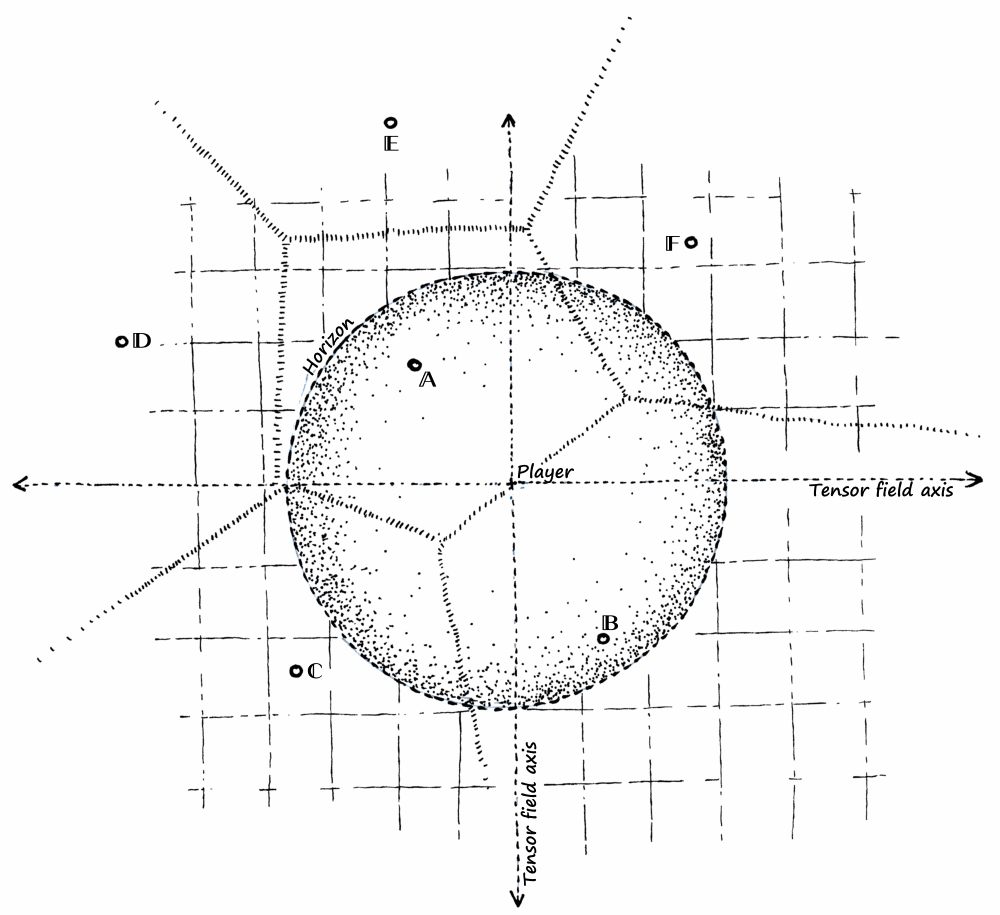 Since we’re moving along the surface of a sphere, our landscape is two-dimensional. This means we can draw a two-dimensional tensor field where certain coordinates for a fixed τ. Between these coordinates terrain tensors can be interpolated: