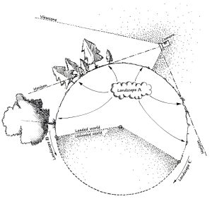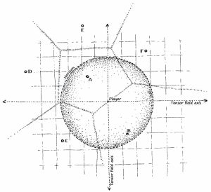Now if we move along our surface world, we can use this tensor-field to determine what new landscapes to generate at the boundary. But even more interestingly, we can generate a new tensor field based on the game play history. For example, imagine we’re standing in the middle of a field and we walk in a straight line due North. After 60 steps we’ve reached the old boundary of the world (i.e. where the boundary was before we started walking) and before us we see a giant swamp. Now we walk 60 meters due South until we’re back where we started. The swamp has disappeared beyond the visible boundary and we’re back in the field. Now we walk 60 steps in the NNE direction, very similar but not identical to the earlier path taken. Now, instead of a swamp, we’re greeted by a thick forest, even though we’re only ~15m away from the point where we turned around not so long ago. This should not be possible, but because we can generate brand new landscapes along the visual boundary, our spherical world in fact behaves as though it has a large negative curvature, rather than the positive curvature we’d expect from a sphere. After all, what we’d expect from a sphere is that if you walk in a straight line, no matter what direction you walk in, eventually you’ll always end up in the same spot, i.e. directly opposite the point from where you started.