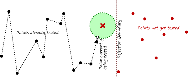 The image above provides a snap-shot of the search algorithm just prior to step 4. All the black points have already been tested and almost every new point turned out to be closer than the previous one. We’ve just tested the point that was nearest to × and the green circle represents the remaining area in which even closer points may be found. The right-most edge of the circle defines the location of the rejection boundary. The next point to be tested is just beyond this boundary and thus it and any subsequent points still left in the collection cannot possibly yield a better result then we have already.