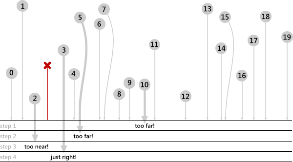 A binary searcher always operates on the same basic principle, which is then recursively applied over and over until a solution is found. We know that h is somewhere in between the extremes of the entire collection. We can ascertain this by making sure that h is to the right of the first point (0) and to the left of the last point (19). So we take the point halfway in between 0 and 19 and test whether it is to the left or to the right of h. That point happens to be #10 and it happens to be to the right of h. So now we know that the real answer must be somewhere between 0~10.