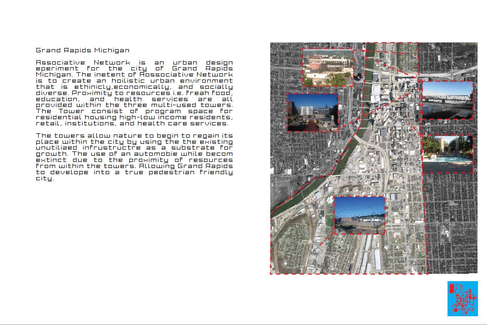 Associative Network[2] is an urban design eperiment[3] for the city of Grand Rapids[4] Michigan. The inetent[5] of Aossociative[6] Network is to create an hoilistic[7] urban environment that is ethinicly[8],[9]economically, and socially diverse. Proximity to resources i.e. freah[10] food, education, and health services are all provided within the three multi-used[11] towers. The Tower[12] consist of program space for residential housing[13] high-low income residents, retail, institutions, and health care services.