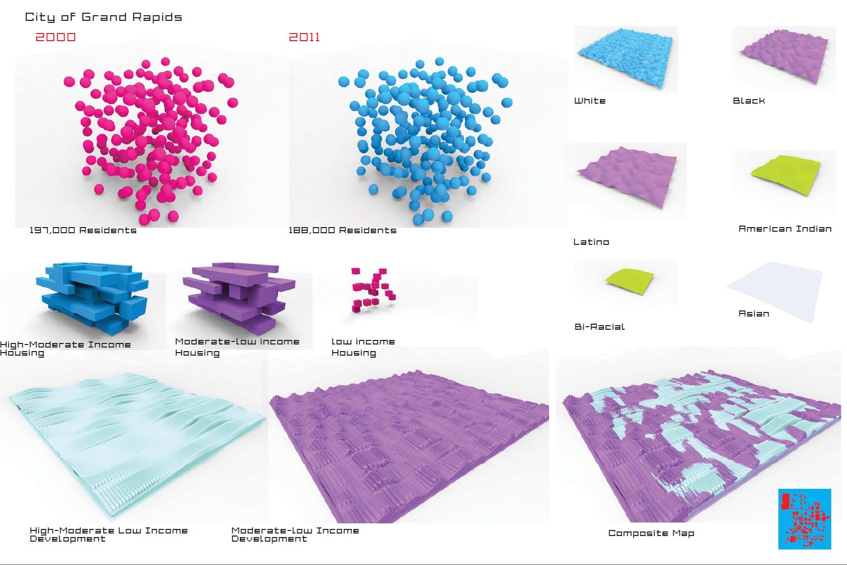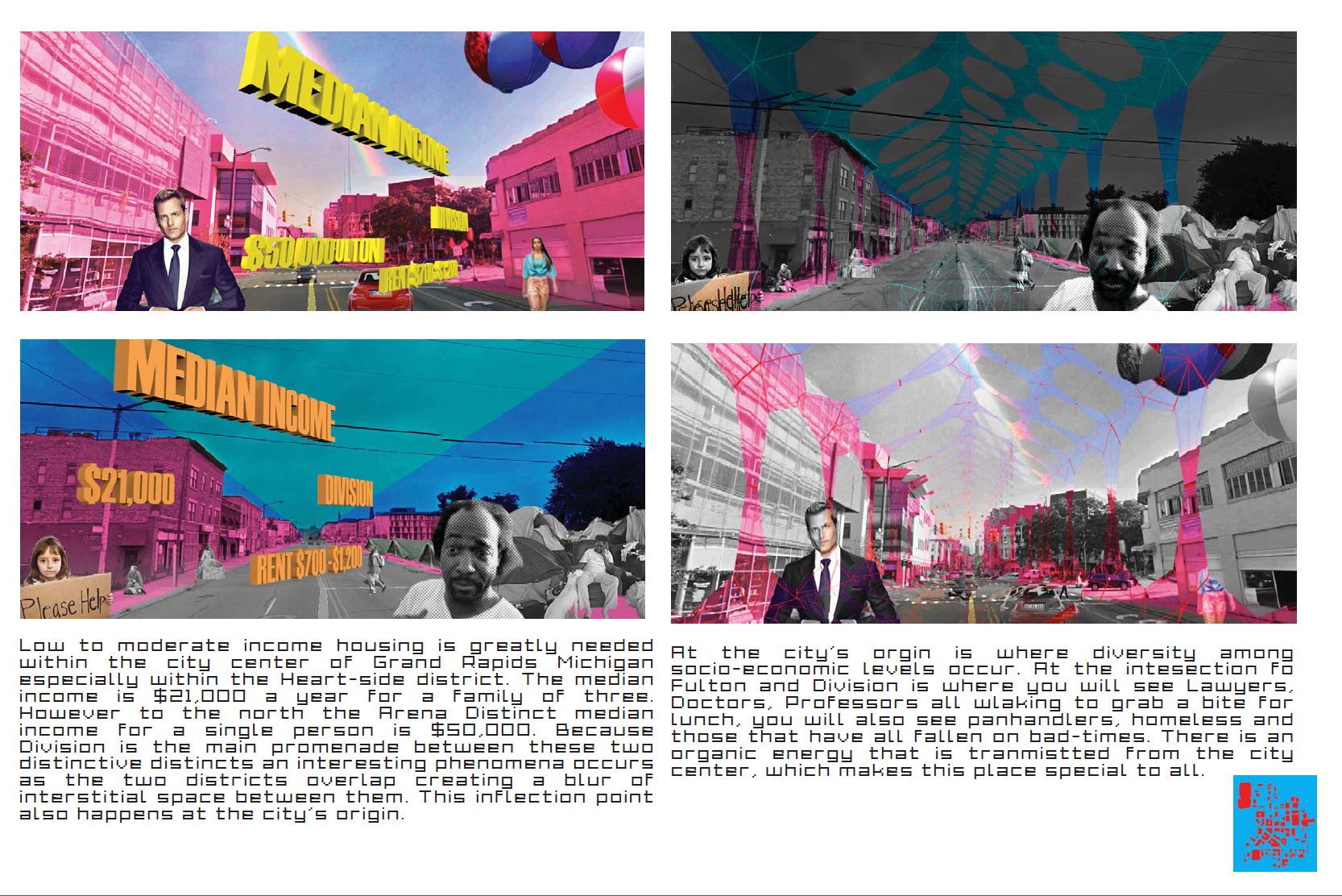 Low to moderate income housing is greatly needed within the city center of Grand Rapids, Michigan, especially within the Heart-side district. The median income is $21,000 a year for a family of three. However to the north the Arena district median income for a single person is $50,000. Because Division Ave. is the main promenade between these two distinctive districts, an interesting phenomenon occurs as the two districts overlap creating a blur of interstitial space between them. This inflection point also happens at the city’s origin.