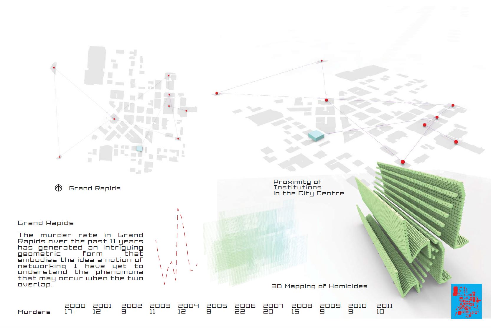The second important piece of analysis concerns the murder rates in Grand Rapids, again measured over the 2000~2011 period. The top half of the page does not seem to be related to this though as it seems to be a map with “institutions” on it. I do not know which institutions these are (law-enforcement, health-care, government, education?) but all of them are connected into a single graph. However not every possible connection is made, or indeed even every nearest connection. Some institutions have a valence of only one, the most heavily connected institution has a valence of four. What do the connections mean? What is the blue box and why is it different from the red dots? Why are we shown the same image twice, once in plan view and once in perspective? When “proximity” is mentioned, what sort of proximity? The graph seems to indicate a Euclidean distance measure. Why not measure the distance in terms of actual travel distance? Or travel time?