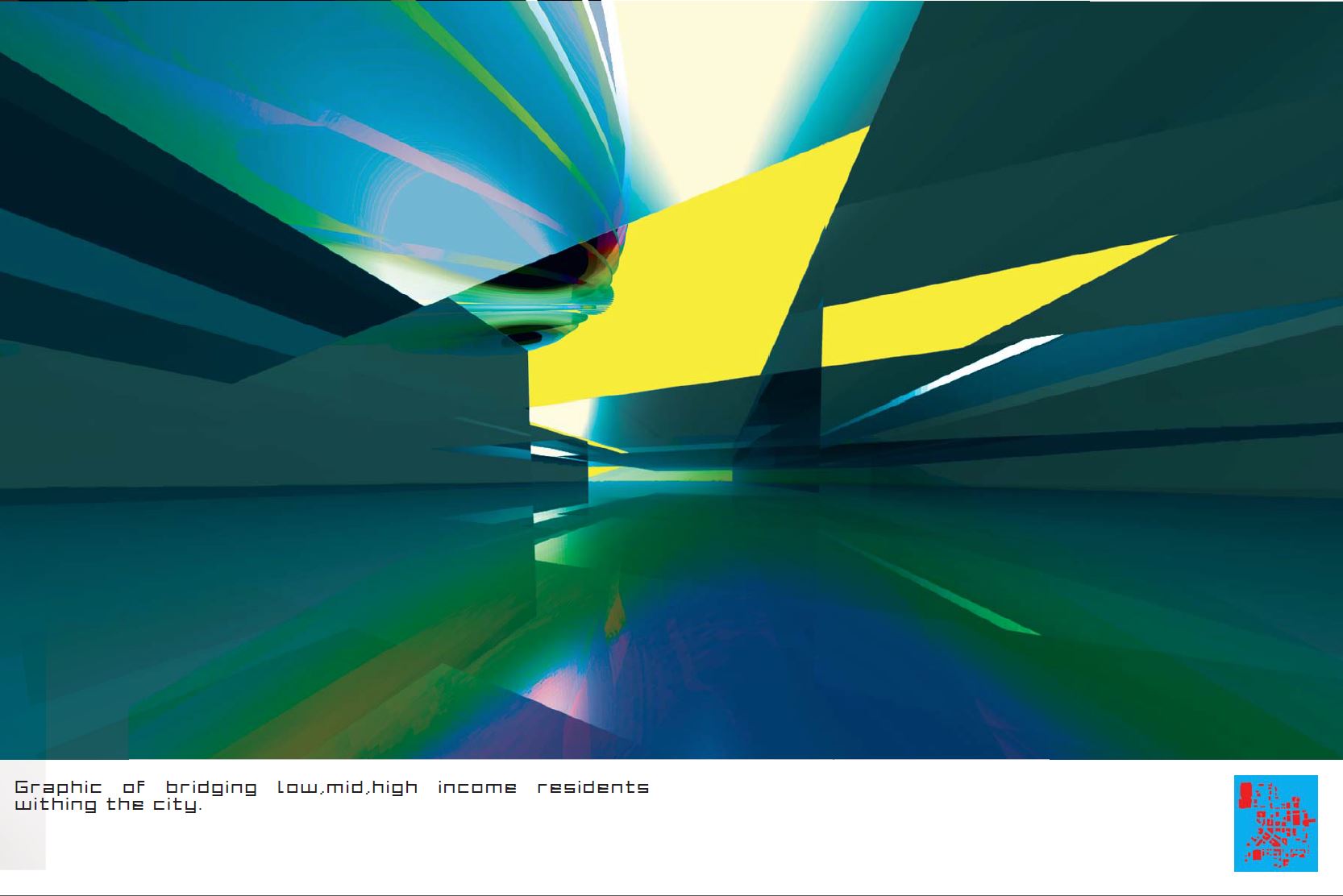 A very colourful interlude representing the “bridging [of] low, mid [and] high income residents”. I can’t really work out what I’m looking at. Is this an abstract or a physical model? If it’s physical, how does one bridge residents? Not much I can say about this image except that I’ve seen many like it and not just in academia, but also in professional architecture. Extreme perspectives, transparency, reflectivity and an unfamiliar colour palette are combinations that would make any image hard to read and yet many architects seem partial to this style.