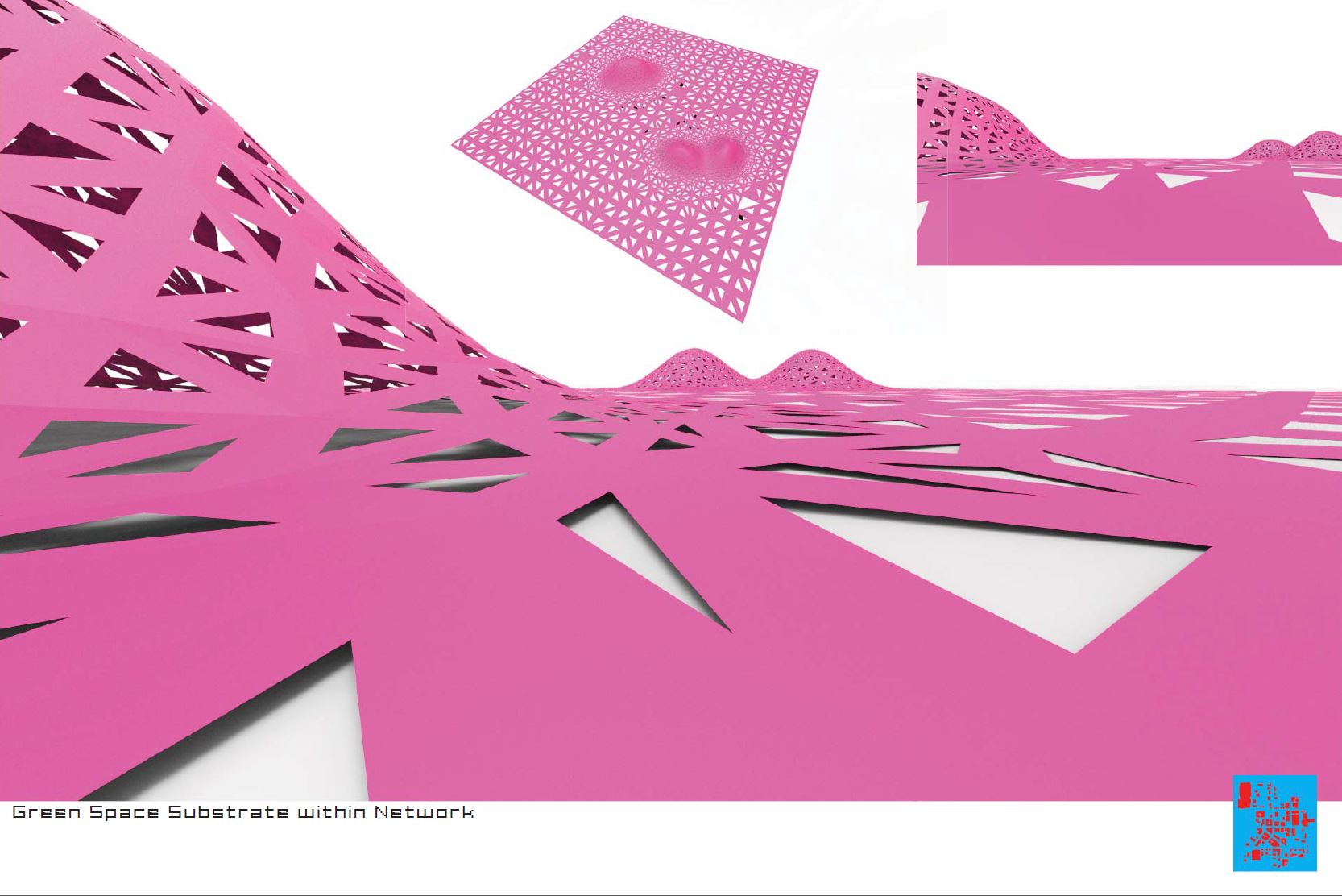 The image above represents what the author calls “Green Space Substrate within Network”. I know what all those words mean but the only two I can put together are “green” and “space”. A green space in an urban plan is presumably where we find an above average amount of plants and trees. Perhaps just a tree-lined avenue, maybe even a park. Different sciences use different definitions for the term “substrate”, but in general it tends to refer to the bottom layer of a system. The word substrate has been used before on page 1 where the existing infrastructure was designated as a substrate for green growth. I can sort of see the sense in that, but the image on this page doesn’t seem to have anything to do with the existing infrastructure of Grand Rapids. I can probably venture a couple of guesses of how the pink shape translates into an architectural design but that really is the responsibility of the author.