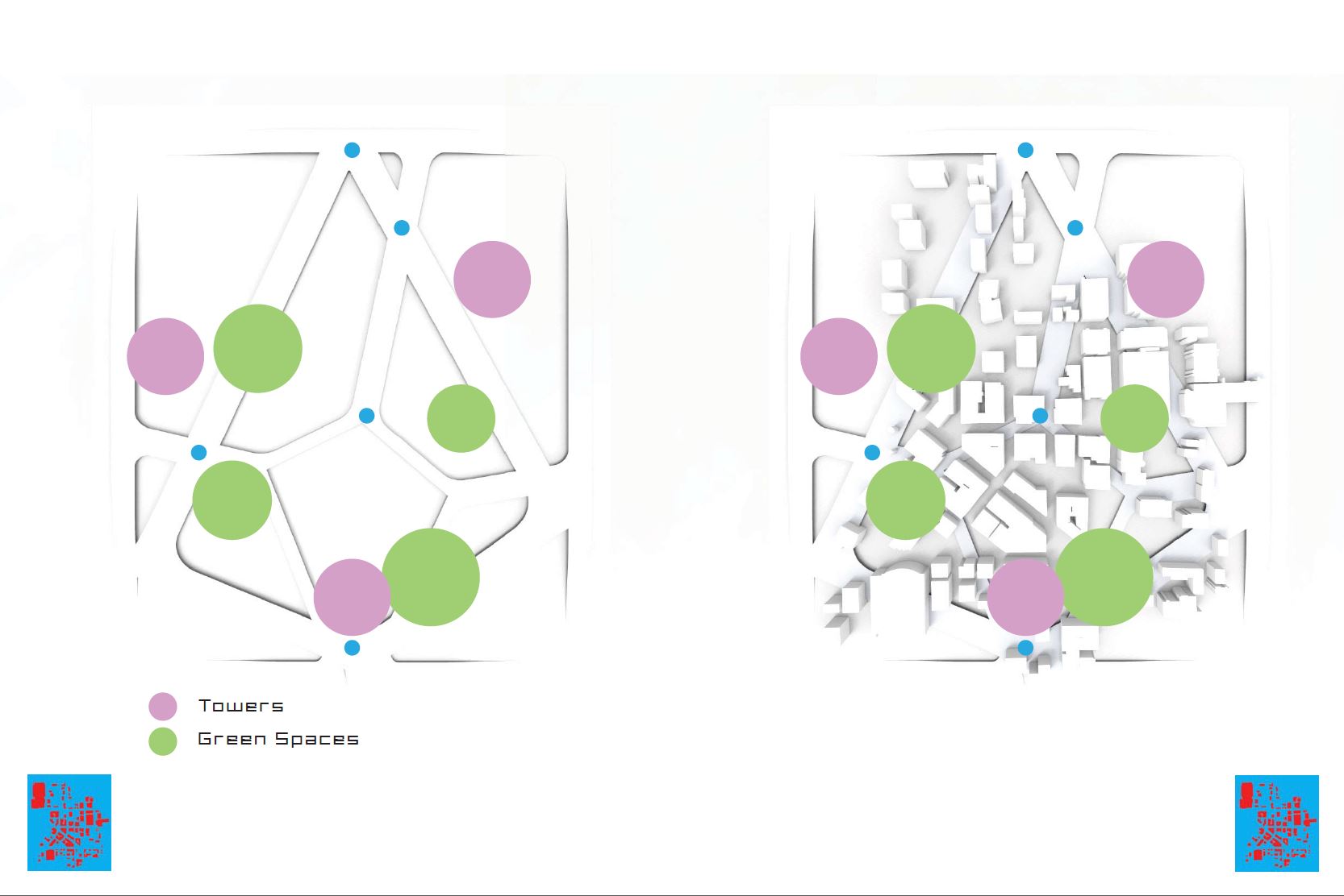 At this point individual properties seem to be behind us and we’re presented with an image of both buildings and green space as they appear together in this project. There are three locations where towers will be constructed and four areas are designated as “Green Spaces”. Never mind that the distribution of green dots is completely different from the pink bulges on the previous page. The locations of both purple and green dots are not justified, or —if they are— those justifications have been omitted. They seem to intersect the existing built environment in awkward ways. There is no scale, no north direction, no explanation of what the blue dots are or indeed what the network of (presumably) wide thoroughfares is supposed to accomplish.