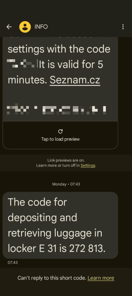 The second time I used the system (last week) I was delayed even more. Having arrived a full hour ahead of time just in case I ran into difficulties again, I only made my train with seconds to spare. This time, the fault was not just the bad design of the software, but bad implementation. I had already noticed at the time of storage that the locker I was assigned (E2) did not match the locker number in my SMS (E31). I should have taken a photo of the actual locker, but by the time I realised the discrepancy I had already closed the door, and by the time I finally got it open again I was only thinking of getting to Nástupiště 5J as quickly as possible.